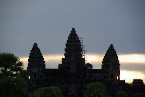 Wir haben es tatsächlich geschafft! Heute morgen sind wir um 4 Uhr aufgestanden und sind nach Angkor geradelt um uns dort den Sonnenaufgang anzuschauen. Wie zu erwarten, waren wir nicht die Einzigen, die diese Idee hatten und so war es trotz der frühen Stunde ziemlich voll auf den Wiesen vor Angkor. Wegen des schlechten Wetters war der Sonnenaufgang zwar nicht so besonders, doch wir konnte trotzdem ein paar schöne Bilder machen. Anschliessend waren wir erstmal frühstücken, mit Blick auf Angkor Wat natürlich. Danach folgte das Wichtigste, die Besichtigung von Angkor Wat. Bevor ich euch mit irgendwelchen Fehlinformationen füttere, verweise ich an dieser Stelle lieber an WIKIPEDIA und WIKITRAVEL. Die Besichtigung der beeindruckenden Anlage und der darin vorhandenen Reliefs beschäftigte uns ziemlich lange, doch war mehr als lohnend. Wir waren erstmal so fertig, dass wir uns in ein klimatisiertes Café verzogen. Unser Aufenthalt dort wurde von höherer Stelle unweigerlich verlängert, als sich ein heftiges Gewitter über Angkor ergoss.